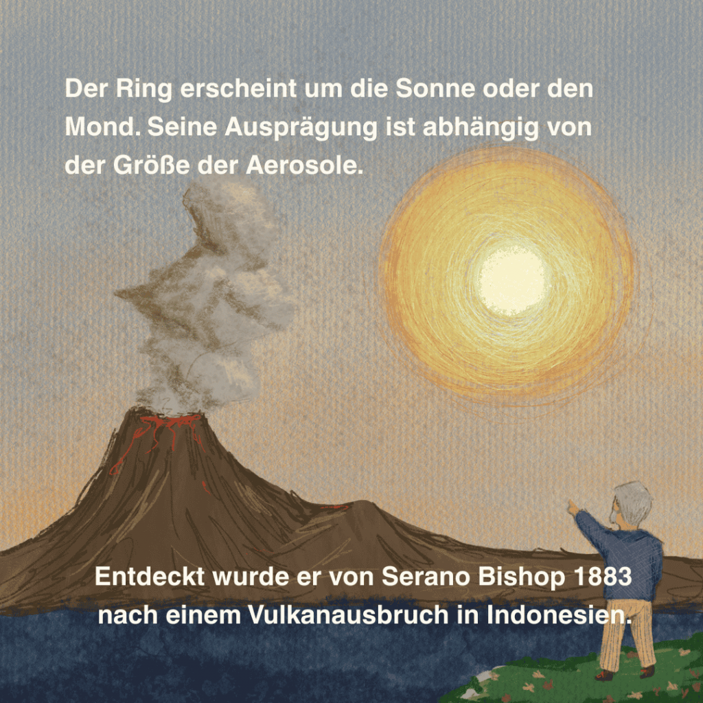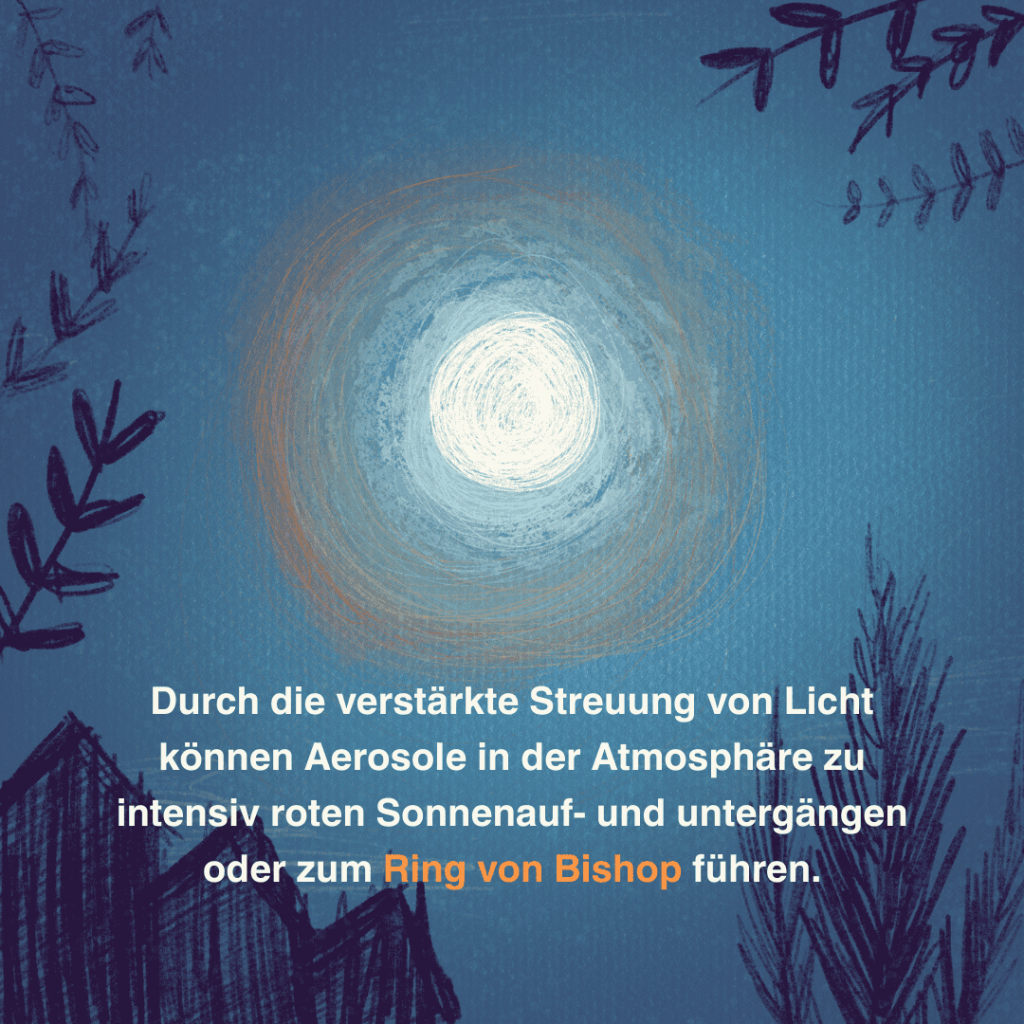 Letztes Mal haben wir erfahren, dass vulkanische Aerosole in der Atmosphäre diese kurzfristig kühlen können. Auch optisch machen sich die Aerosole bemerkbar. Zum einen verursachen sie durch eine verstärke Streuung in der Atmosphäre intensiv rote Sonnenauf und -untergänge, zum anderen kann es um die Sonne oder den Mond zu einer optischen Erscheinung kommen, die als Ring von Bishop bekannt ist.