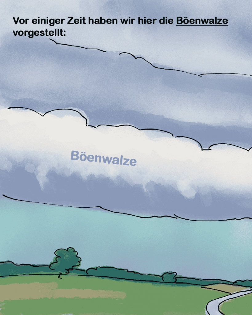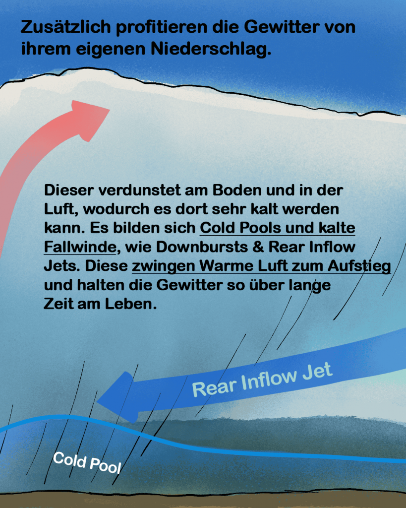 Der Fortbestand dieser Linie hängt von zwei Faktoren ab: dem Cold Pool und der Windscherung. Der Cold Pool (bereits in einem anderen Post erklärt) entsteht, wenn Regen und Verdunstung die Luft stark abkühlen. Diese kalte Luft breitet sich am Boden aus und schiebt sich dabei unter die wärmere, leichtere Luft. An der Vorderseite der Linie wird die Warmluft dadurch zum Aufsteigen gezwungen und es bilden sich immer wieder neue Gewitter. Gleichzeitig sorgt die Windscherung, also die Veränderung von Windrichtung und Windgeschwindigkeit mit der Höhe, dafür, dass der Aufwindbereich nicht von der kalten Luft abgeschnitten wird. So kann sich die Squall Line über längere Zeit selbst erhalten.