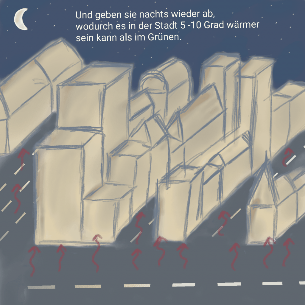 Diese Effekte sind vor allem in Hitzeperioden wichtig, da sie das Wohlbefinden verbessern und Hitzestress reduzieren können. Im Gegensatz dazu fördern dichte Bebauung, enge Straßenschluchten und wenig Begrünung die sogenannte städtische Wärmeinsel.