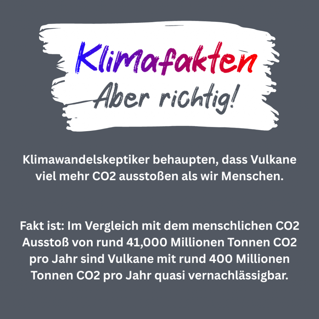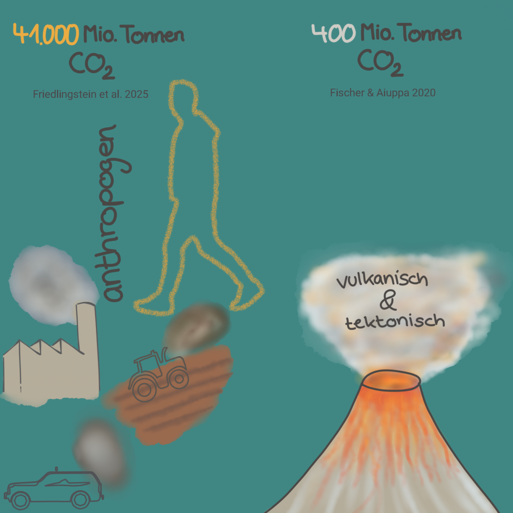 Nun zu den Vulkanen, es ist gar nicht so einfach zu bestimmen wie viel CO2 diese wirklich emittieren. Jedoch wurden im letzten Jahrzehnt durch groß angelegte Messungen immer genauere Schätzungen möglich. In ihrer Veröffentlichung fanden Fischer & Aiuppa (2020), dass durch vulkanische und tektonische Ausgasungen ca. 400 Millionen Tonnen CO2 pro Jahr freigesetzt werden. Im Vergleich zu den anthropogenen, also vom Menschen verursachten, Emissionen von 41000 Millionen Tonnen CO2 pro Jahr (Friedlingstein et al., 2025) ist das dann aber doch eher vernachlässigbar. Vulkane stoßen also gerade mal knapp 2% so viel CO2 aus wie wir Menschen.