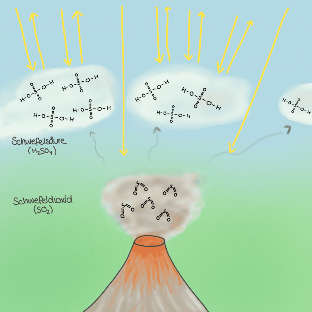 Viel bedeutender für das Klima als der CO2 Ausstoß von Vulkanen ist allerdings der Transport von Rauch und Aerosolen in die Stratosphäre über Vulkanausbrüche, wie 2022 beim Ausbruch des Hunga Tonga-Hunga Ha’apai im Südpazifik. Während sich die Aerosole in der Stratosphäre aufhalten, schirmen sie die Erde von der einfallenden Sonnenstrahlung ab und kühlen unsere Atmosphäre dadurch. Vor allem SO2 (Schwefeldioxid) wird relativ schnell zu H2SO4 (Schwefelsäure) umgewandelt und bildet Wolken, welche sehr effektiv die solare Strahlung reflektieren. Dieser Effekt kann sich je nach Größe des Ausbruchs über mehrere Jahre erstrecken. Der mächtige Ausbruch des Hunga Tonga-Hunga Ha’apai verringerte die Bodentemperatur in der südlichen Hemisphäre wahrscheinlich nur um 0.037°C. Darauf zu hoffen, dass wir den Klimawandel mit Hilfe von simulierten Vulkanausbrüchen bekämpfen können, scheint damit aussichtslos und geht zudem am eigentlich Problem vorbei, der Reduzierung unseres CO2 Ausstoßes.