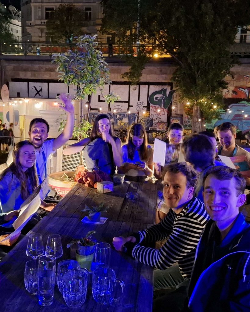 Aber auch Vernetzung ist ein wichtiger Punkt auf der EGU und zu diesem Zweck verbrachten einige jDMG-Mitglieder einen gemeinsamen Abend, welcher zuerst bei einem leckeren Essen im Wiener Dewan begann. Später endete der Abend bei guten Getränken auf dem Badeschiff am Donaukanal.