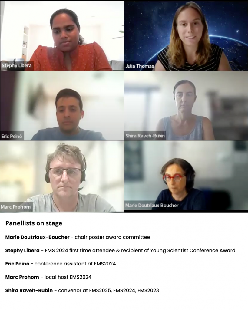 Wie fühlt es sich an, zum ersten Mal an einer Konferenz teilzunehmen? Und wie bereiten sich erfahrene Wissenschaftler:innen oder Mitglieder des Posterpreis-Komitees auf die Jahrestagung vor? Und wie organisiert man überhaupt so eine Konferenz? In diesem EMS Webinar, das von unserer jDMG Ansprechperson Julia Thomas moderiert wurde, haben wir Menschen in verschiedenen Rollen zusammengebracht, um ihre Erfahrungen und Empfehlungen für die nächste Jahrestagung der EMS zu hören!
